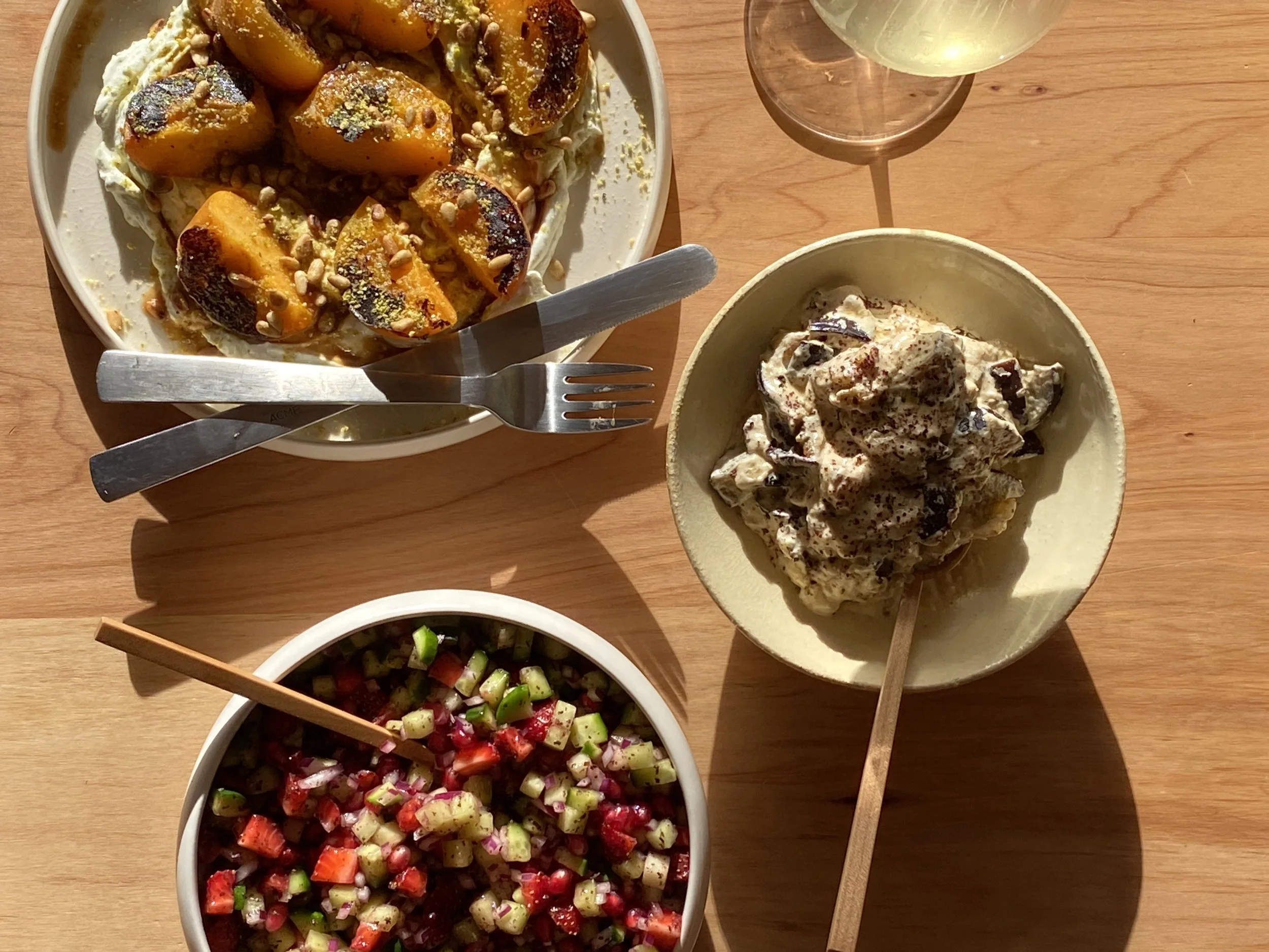 I love me some aubergine and I love me some yoghurt so this is the perfect zingy little dip to whip up for a summer platter. It's still quite chunky so it can be eaten straight off the fork or scooped up with some bread. OG Babaganoush isn't actually a super laborious dish to make anyway but this is like a SUPER quick version.