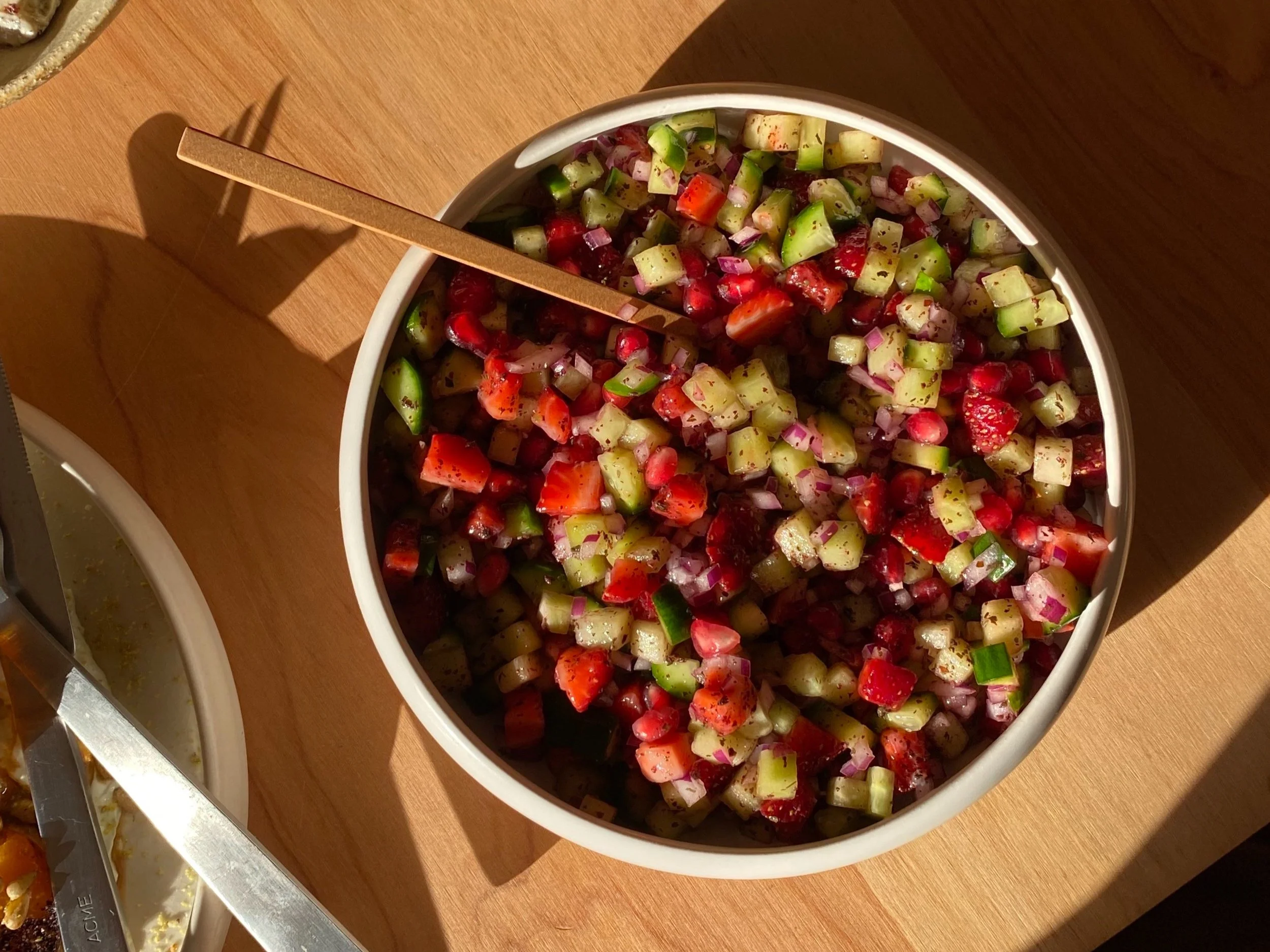I believe the Shirazi salad to be the king of salads. It's very simple but super tasty and something about the fact that it is diced so finely makes it feel more like you are eating a delicacy of vegetables than a salad, a bowl of jewels. My wife is currently pregnant and very keen on melon and strawberries, hence their inclusion - it might not seem like an obvious combination but it did in fact turn out to be pretty yum!
