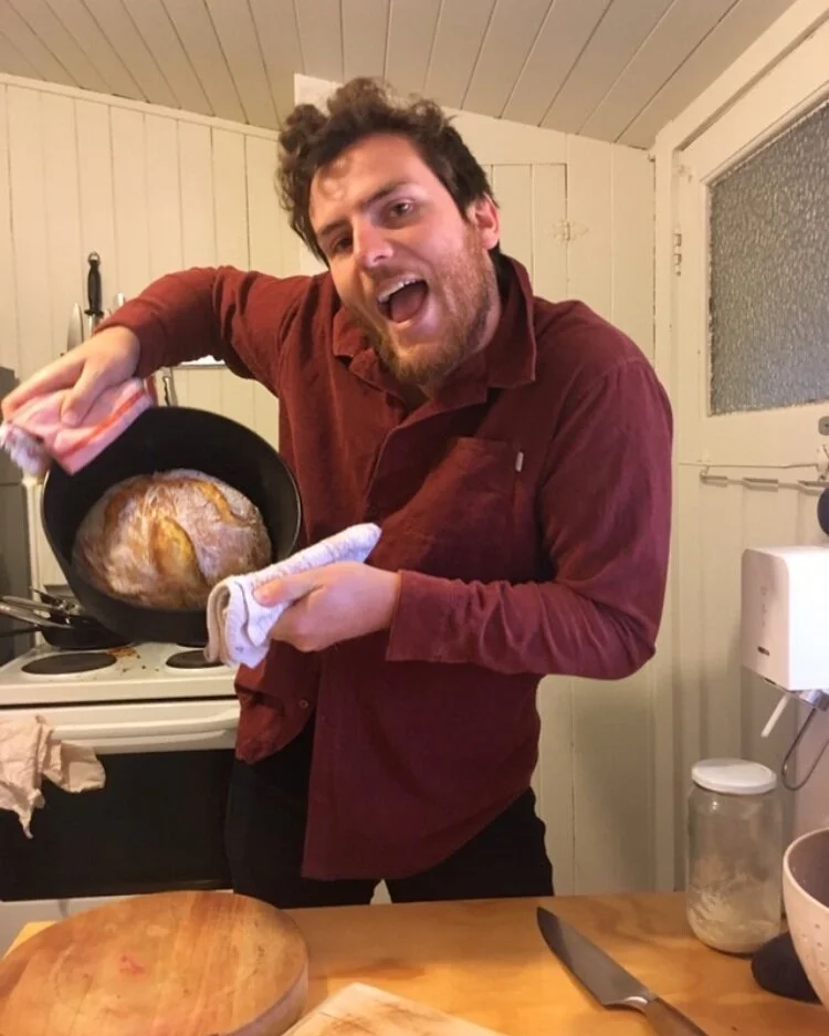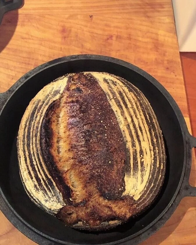 When ready to bake take dough out of bowl onto well floured bench and use well floured hands. fold dough over itself to form a ball (try not to incorporate too much new flour) - work quickly and don’t be fussy, as the dough is wet its hard to do well. Place dough into the dutch over, put lid on.