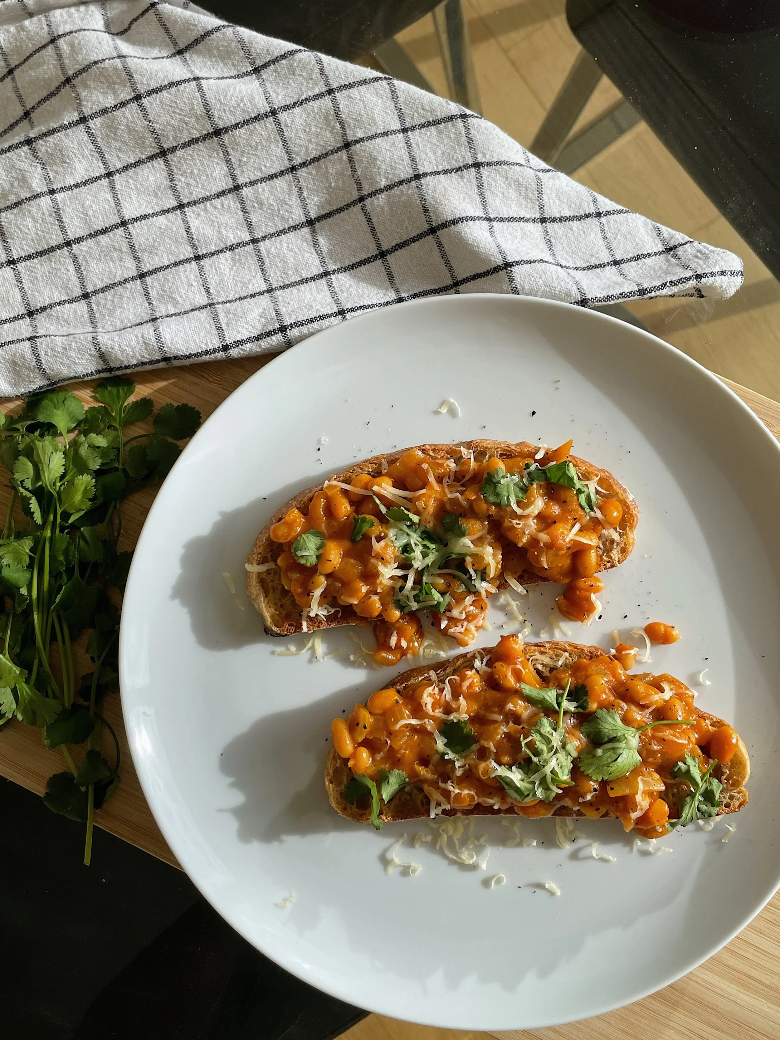 On a serving plate, spread the beans on top of slices of toasted sourdough and garnish with cracked pepper, fresh torn coriander leaves and more grated cheddar cheese.