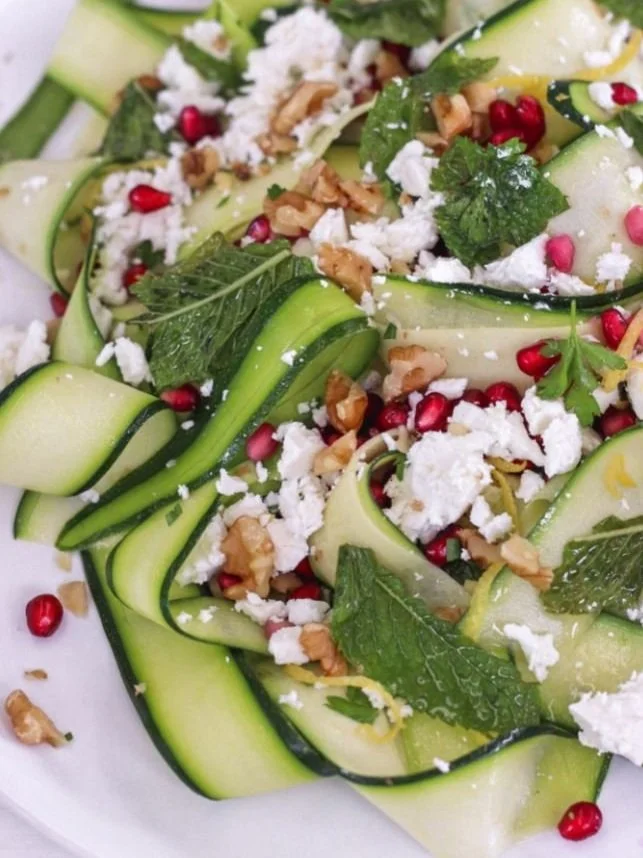 4. Top with the remaining, feta, pomegranate seeds and walnuts,. Then add the lemon zest and salt and pepper. Adding the salt right at the end prevents the zucchini from going soggy.