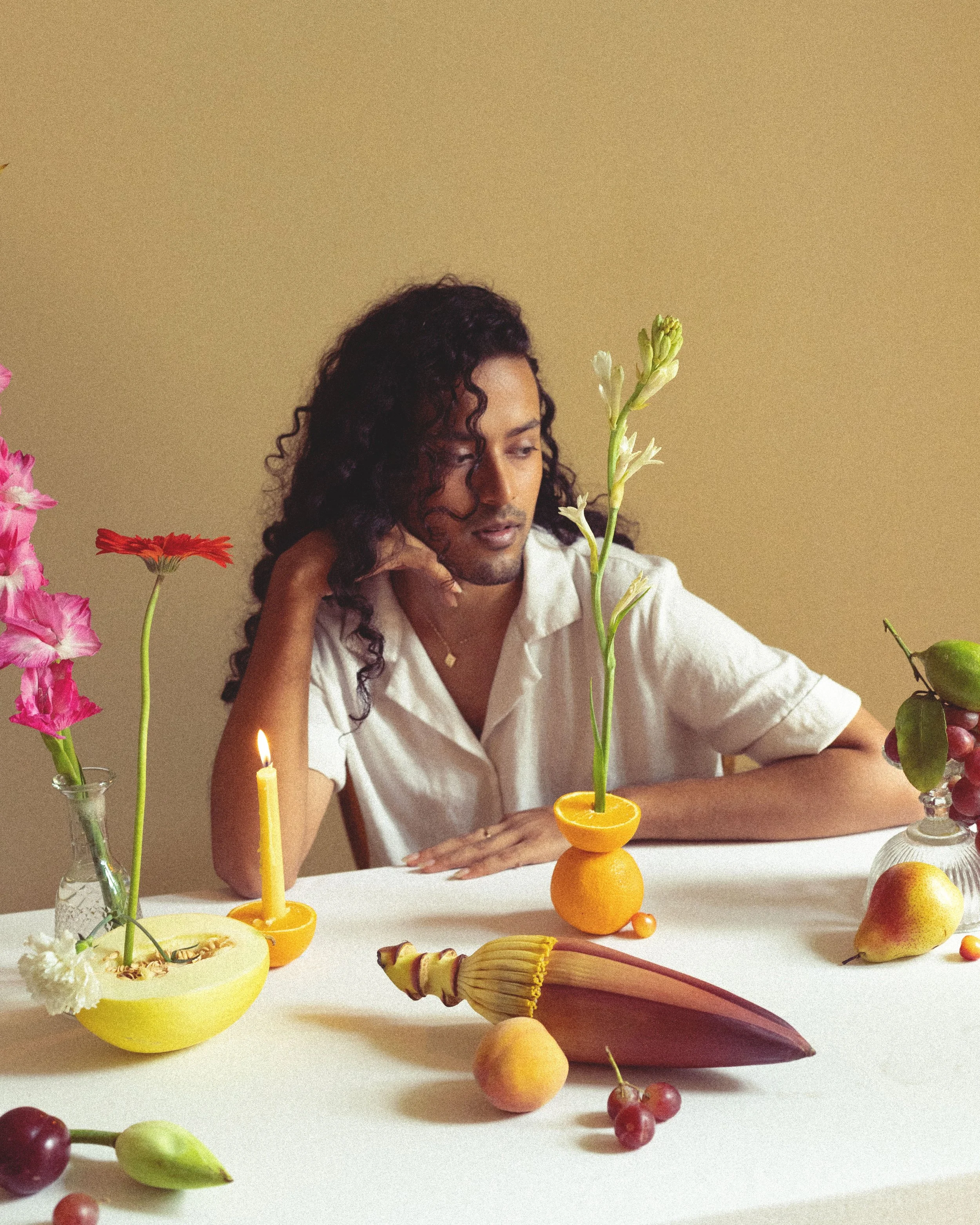 Right now, my inspiration is coming from seasonal things. I’ll go out and see cherries being sold at the market, and I’ll feel so drawn to them. I then start obsessively thinking - cherries, cherries, cherries, what can I do with them? I’ve always been fascinated by fruits, flowers and colours. And travelling really inspires me too. It’s a nice way to just break your normal routine and step into a different realm. I recently went to Banaras and found myself just observing, not projecting or conceptualising so much. Because when I’m in my own space, I tend to project my imagination and my fantasy onto everything, like with this glass of water. So in Banaras, I was in awe of everything around me.