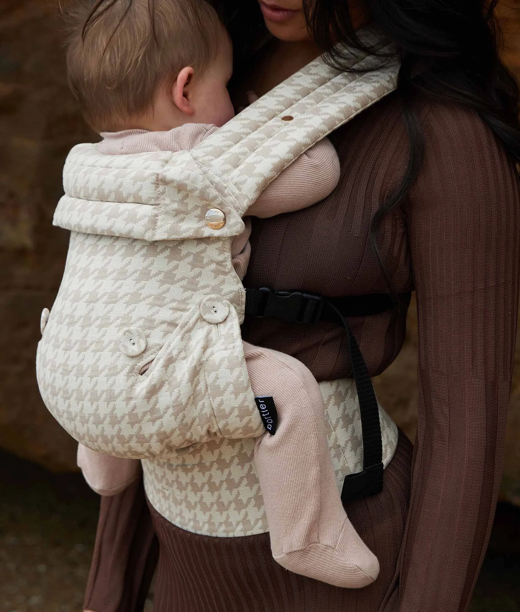 Anything that facilitates a hands-free existence becomes a necessity soon as you welcome a baby. With our second baby en-route I wanted to find something a bit more elegant to use for walks, lunch dates or just doing things around the house. I love Portier’s designs and I've been eyeing this style for a while as it works well in summer as well as winter months. The houndstooth design woven fabric in a cotton/ linen blend works really well with my wardrobe too.