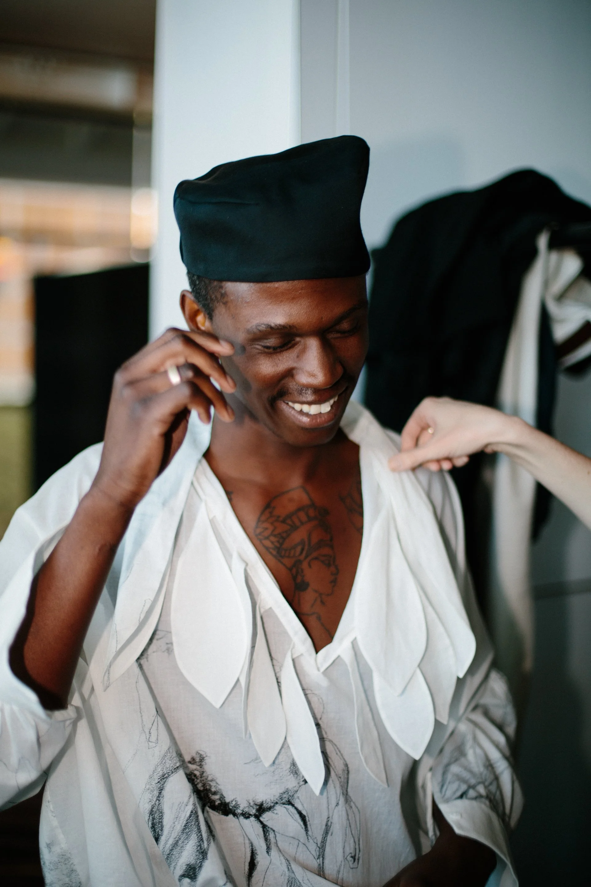 Backstage notes from Anahita — “The energy backstage at Rory’s show was electric. could feel the designers excitement backstage. At the point of getting dressed, the models were completely transformed in ethereal gossamer textures. Striking palette of whites blacks, soft patterns and metallic silver accents. There was this moment when the glasses and hats were added and that’s when you could see the entire vision come together.”