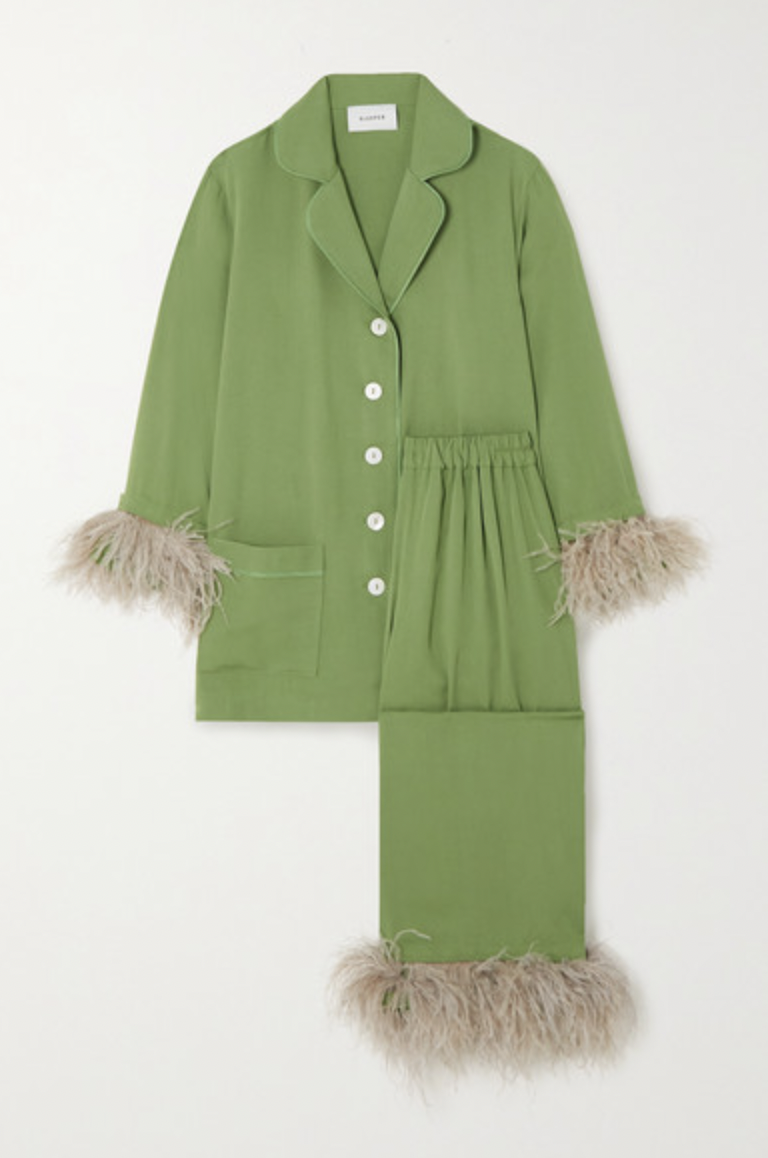 + NET SUSTAIN Party feather-trimmed crepe de chine pajama set, available at Net-a-porter