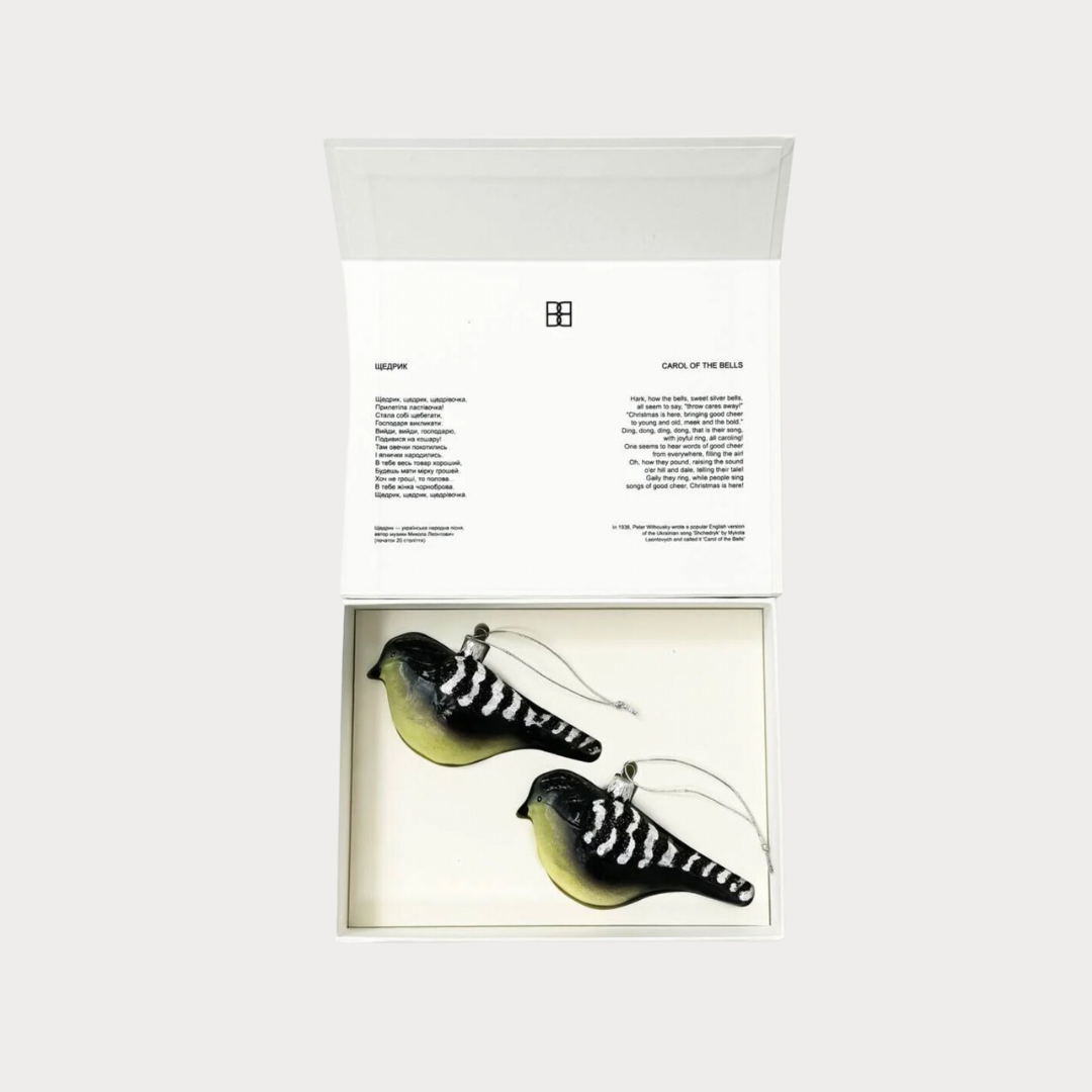 A set of handcrafted glass ornaments inspired by a Ukrainian Christmas carol Shedryk, more commonly known as Carol of The Bells. So special.