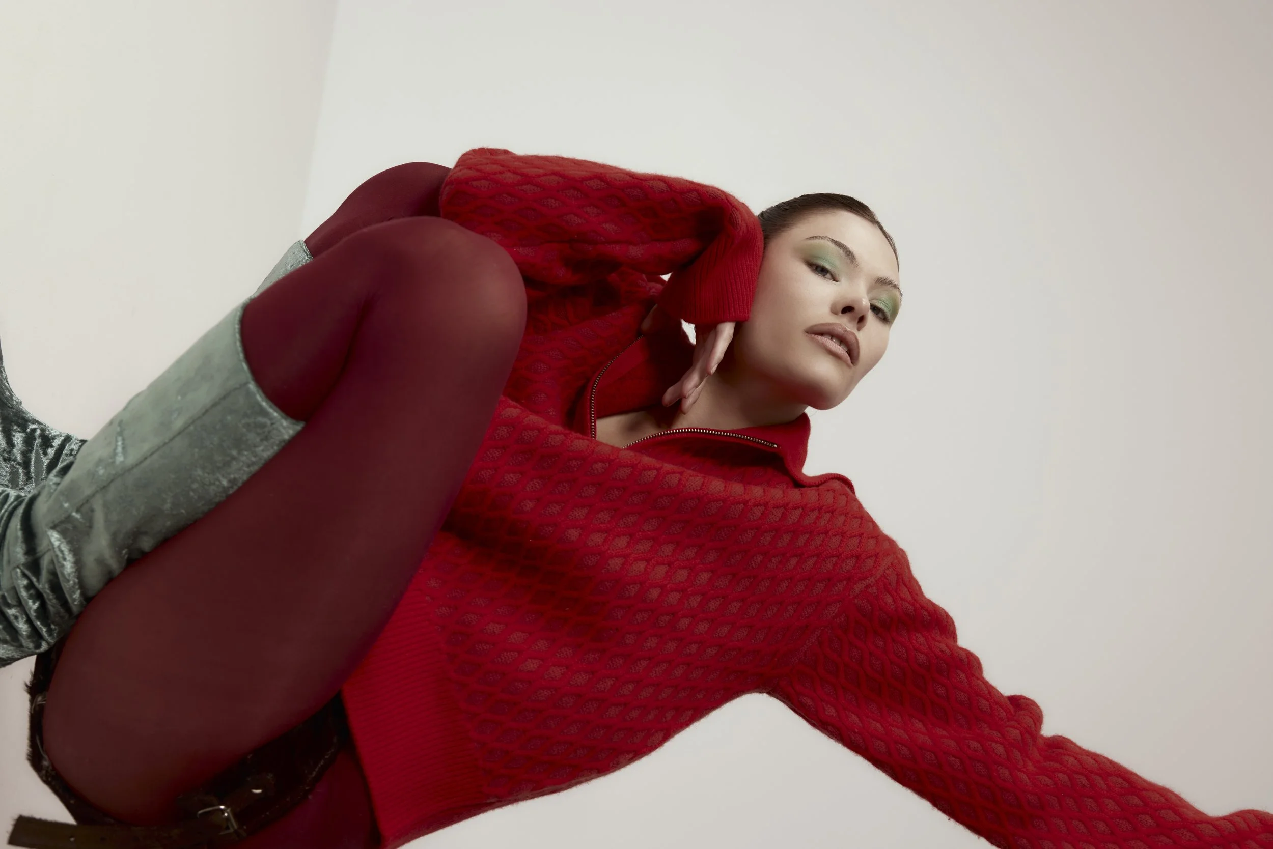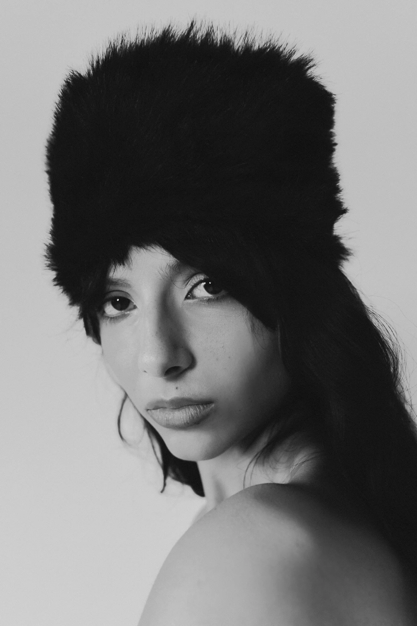 (Above) Anysha wears a Zambesi fur hat with a mohair knit top by Angela Kong and Tibi Indigo Denim Sid Jean from Muse Boutique.