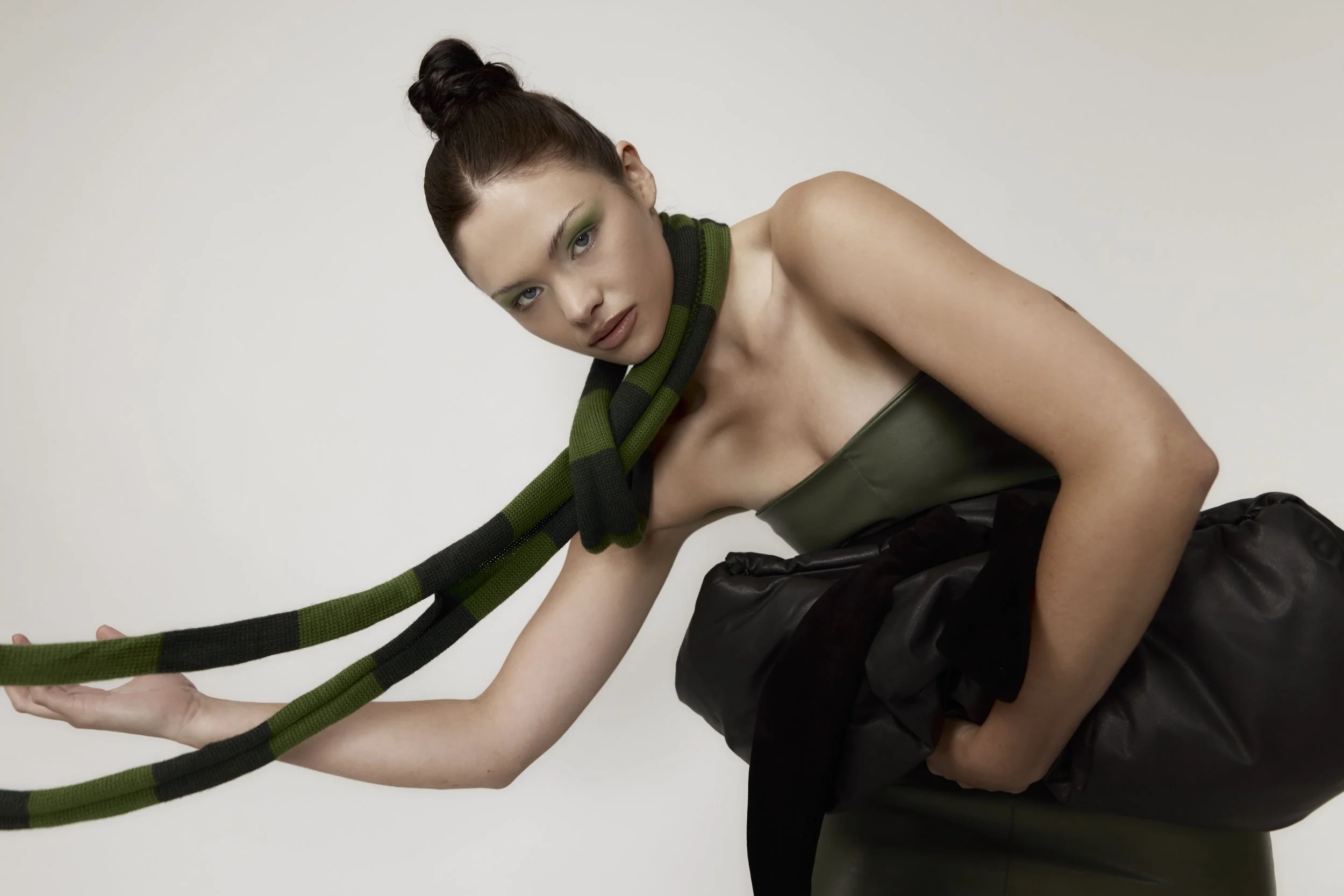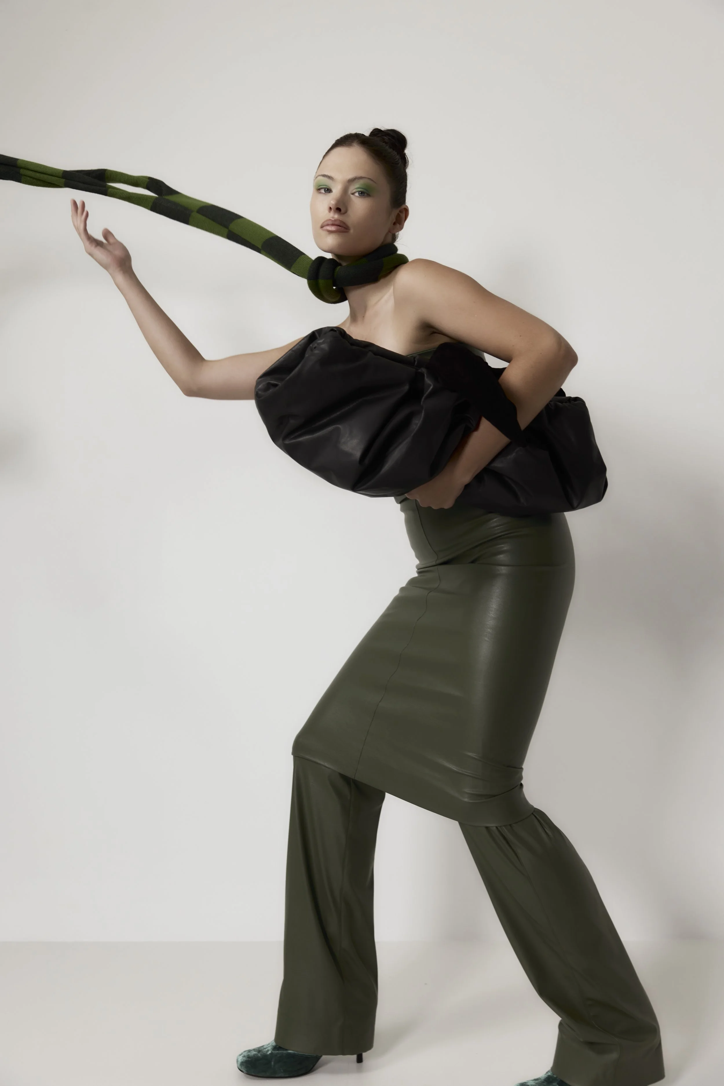 (Right) Ursula wears Zambesi faux leather dress and trousers with the Big Bow Bag by Rory William Docherty and a scarf from Nom*D.