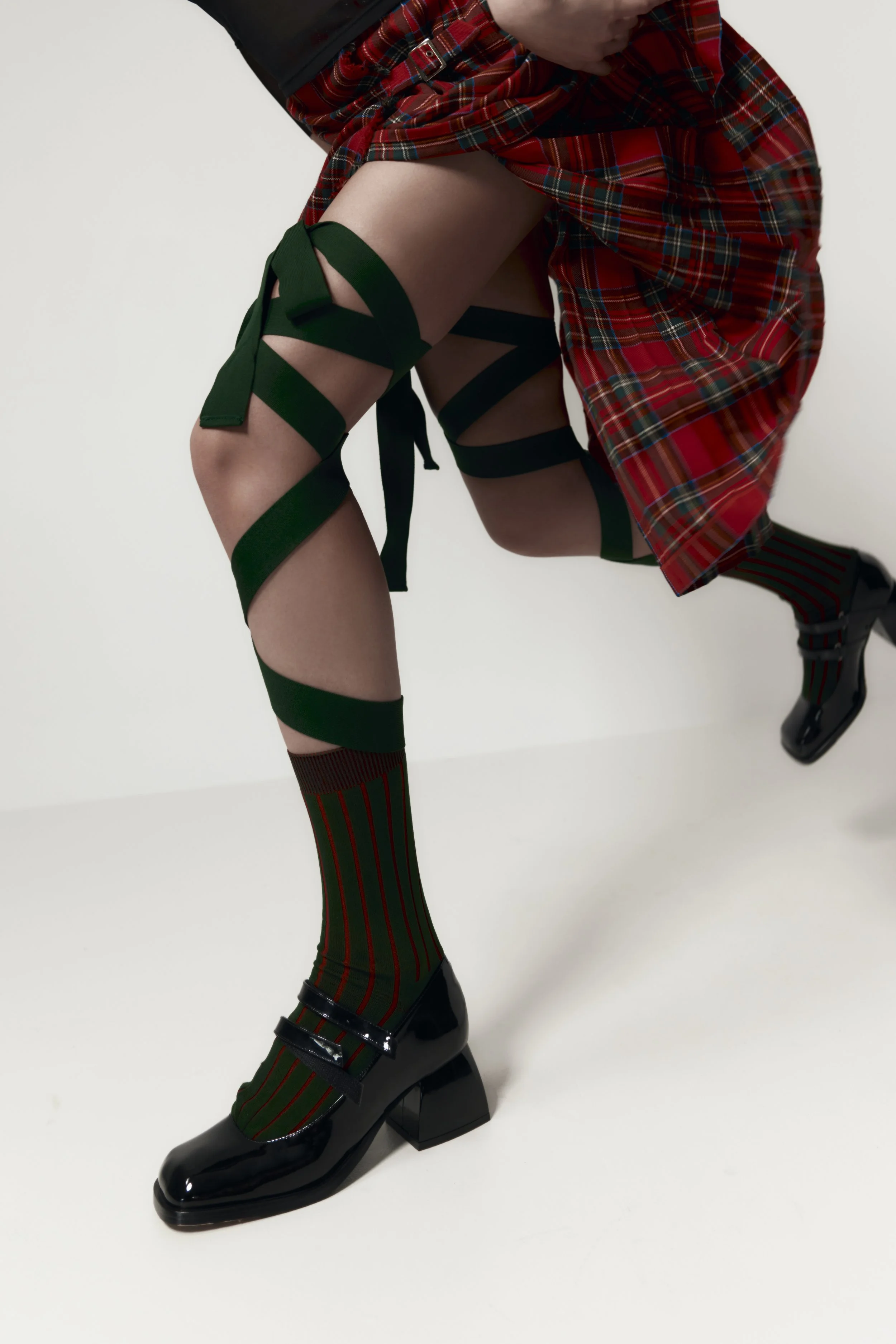 Anysha wears a tartan skirt from Tango Vintage with Catherine Boddy Ribbon Socks and Nodaleto Bulla Bacara heels from