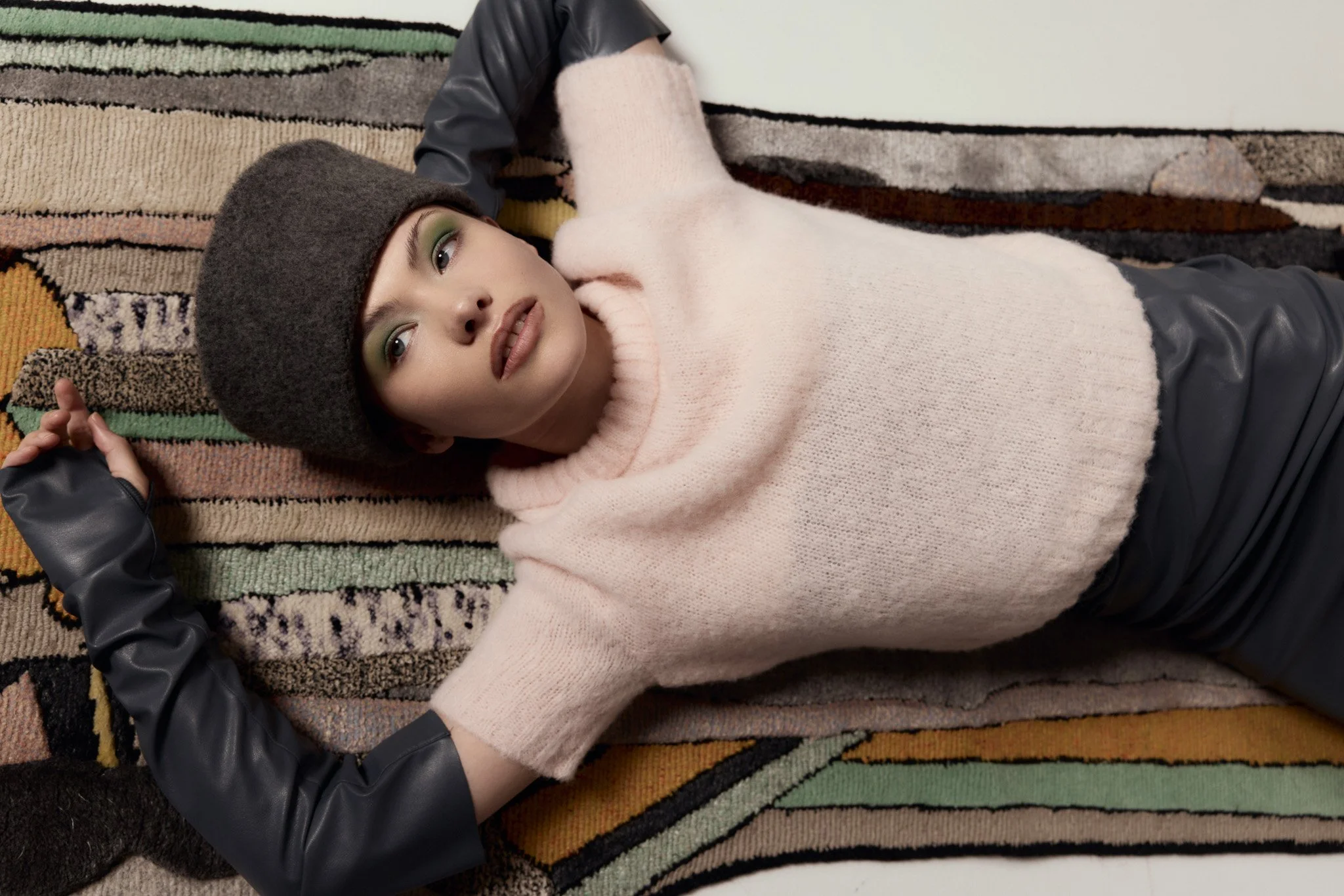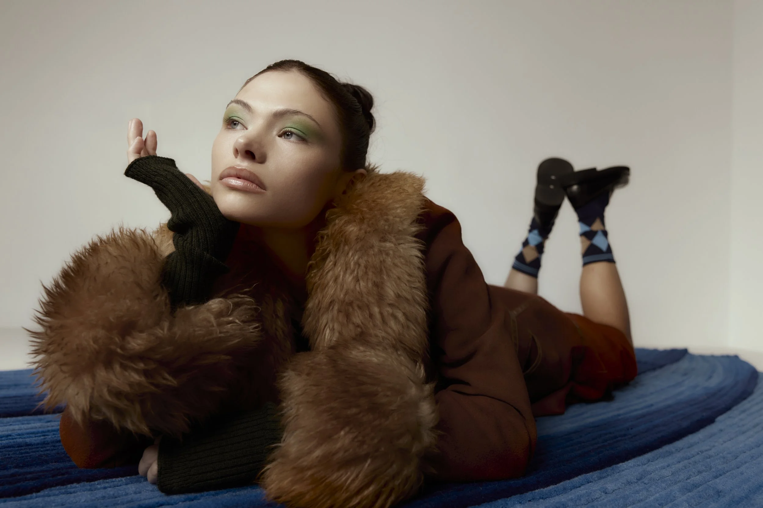 Ursula is wearing a vintage fur trim coat from Tango Vintage, Nom*D knit arm warmers and Scarpa Billie Loafers. CC-Tapis Stoke 1.0 Rug available at Mr Bigglesworthy.